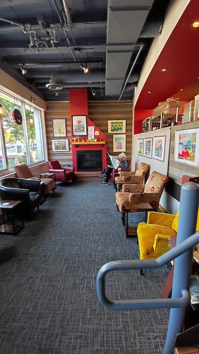 Great coffee shop right next to the lake with cute comfortable chairs near the font window and lots of seating throughout the shop.